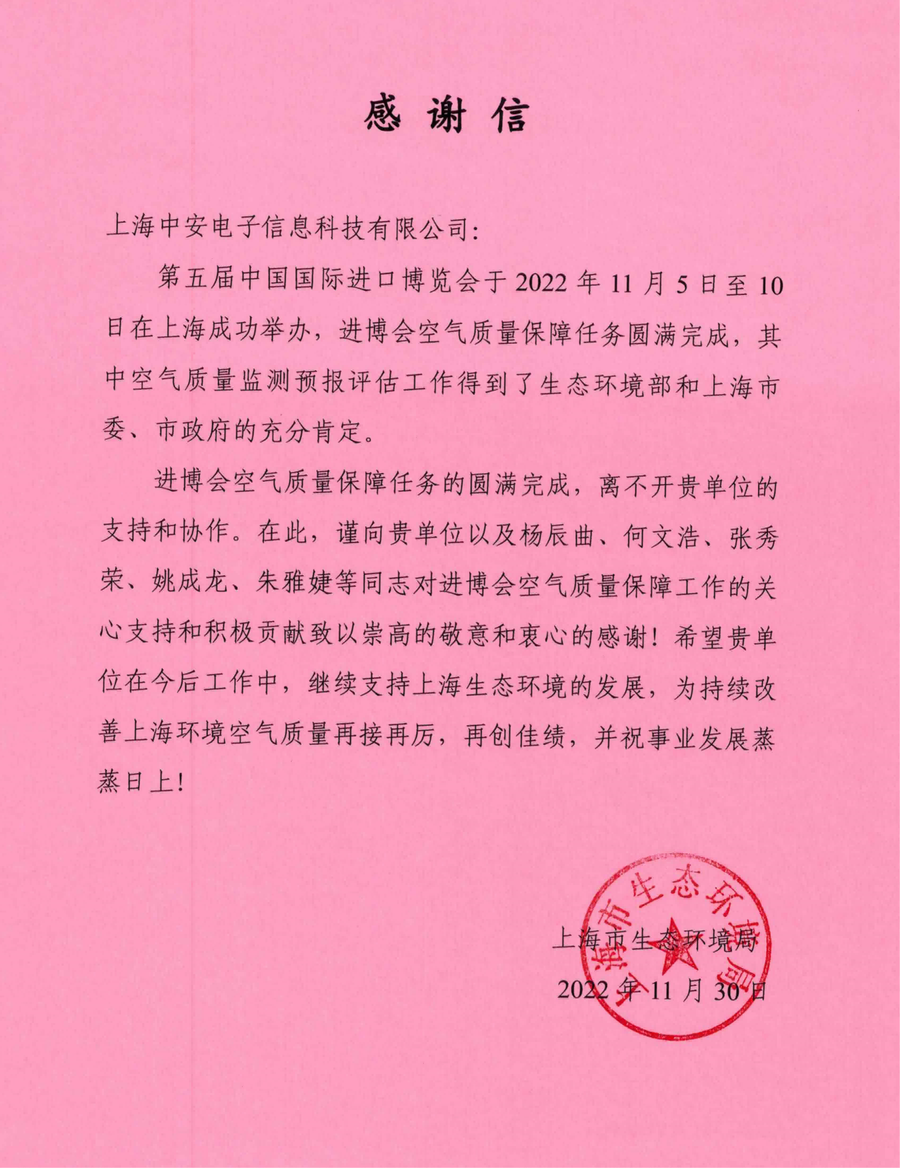 上海環(huán)監(jiān)中心就中安科技在21年國際進(jìn)博會空氣質(zhì)量監(jiān)測預(yù)報工作中杰出貢獻(xiàn)送來感謝信!(2021/12/31)